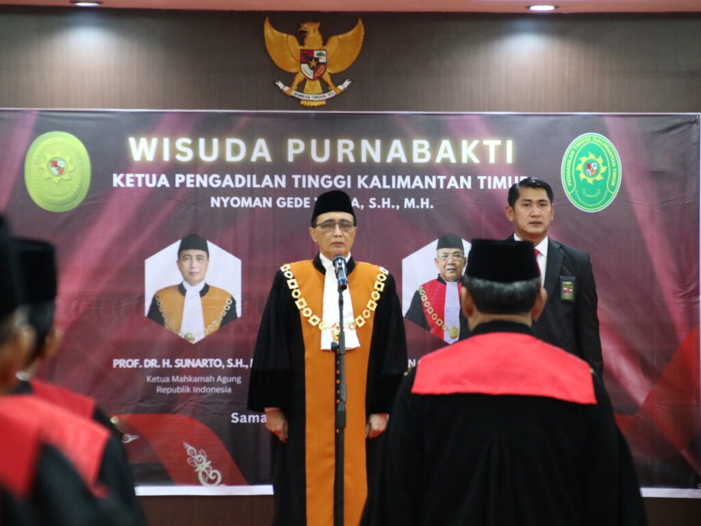 Ketua Mahkamah Agung Republik Indonesia Prof. Dr. H. Sunarto, S.H., M.H. secara resmi melepas Ketua Pengadilan Tinggi Kalimantan Timur, Nyoman Gede Wirya S.H.,M.H yang telah memasuki masa purnabakti. Acara pelepasan ini dilaksanakan di Ruang Sidang Utama Pengadilan Tinggi Kalimantan Timur, 25 Maret 2025. Turut hadir pada acara ini Wakil Ketua Mahkamah Agung Bidang Non-Yudisial, para Ketua Kamar, Sekretaris Mahkamah Agung, Panitera Mahkamah Agung, Direktur Jenderal Badan Peradilan Umum, dan Ketua Umum Dharmayukti Karini. Acara ini diikuti pula oleh keluarga besar Pengadilan Umum yang datang langsung maupun melalui daring.