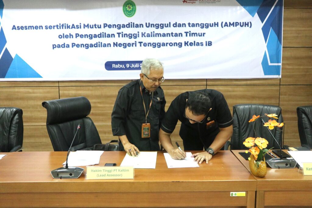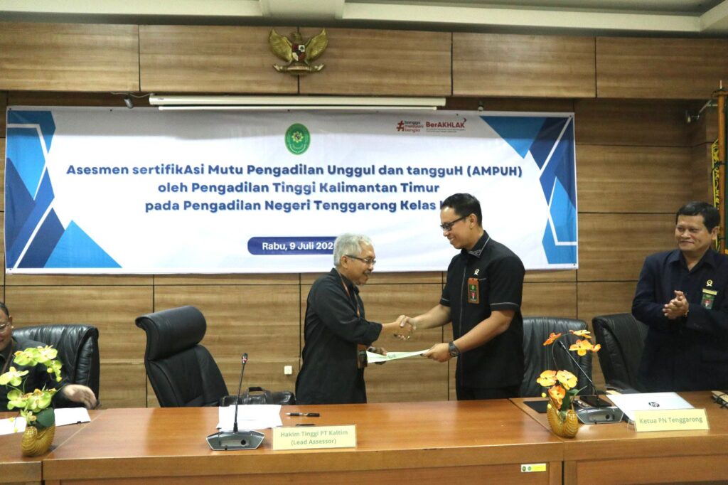 Samarinda,(09/07) Pengadilan Tinggi Kalimantan Timur melakukan assesmen untuk SERTIFIKASI MUTU PENGADILAN UNGGUL DAN TANGGUH (AMPUH) pada Pengadilan Negeri Tenggarong. Assesmen ini dilakukan secara luring sesuai dengan SK DJU Nomor 916/SK.OT1.6/III/2025 tentang PERUBAHAN PERTAMA PEDOMAN SERTIFIKASI MUTU PENGADILAN UNGGUL DAN TANGGUH (AMPUH) DI LINGKUNGAN PERADILAN UMUM. kegiatan ini dilakukan secara Luring tanpa dibebankan ke DIPA Pengadilan Tinggi sesuai dengan arahan nasional dalam efisiensi dalam pengelolaan Anggaran Belanja Perjalanan Dinas. Tim dari Pengadilan Tinggi Kalimantan Timur terdiri dari Lead Assesor Y.M Bapak Dedy Fardiman,S.H.,M.H Y.M. Irfanudin,S.H.,M.H Selaku Assesor bersama Hendro A.F SilitonggaS.Si dan Akid Danardi,S.E sebagai Sekretaris TIM