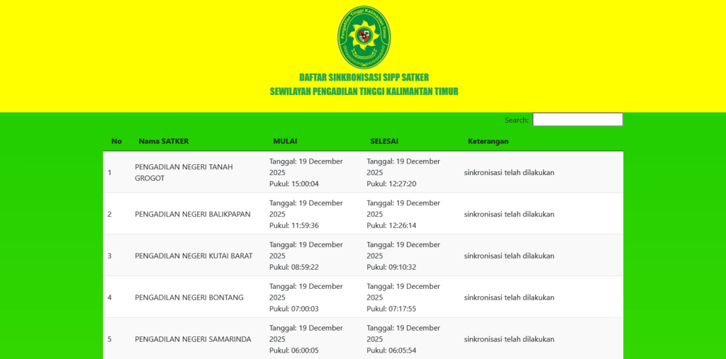 Dashboard Monitoring Sinkronisasi SIPP (Sistem Informasi Penelusuran Perkara) untuk wilayah hukum Pengadilan Tinggi Kalimantan Timur. Aplikasi ini berfungsi sebagai alat pengawasan terpusat untuk memastikan data SIPP dari setiap Pengadilan Negeri telah terkirim dan sinkron dengan sistem di Pengadilan Tinggi.