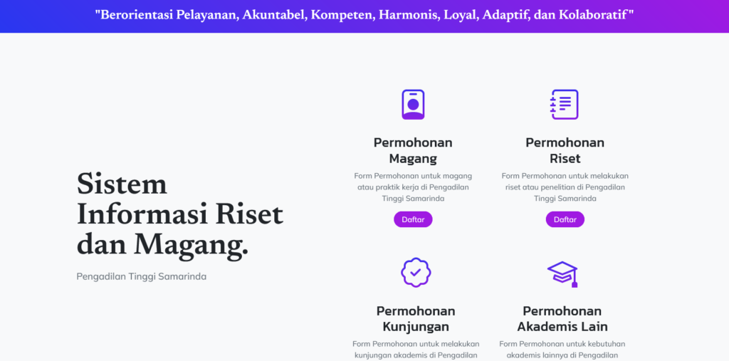 SI-MARIS adalah platform layanan publik berbasis digital yang dikembangkan oleh Pengadilan Tinggi Kalimantan Timur untuk mengelola administrasi permohonan akademik bagi pelajar, mahasiswa, dan peneliti secara transparan dan akuntabel.